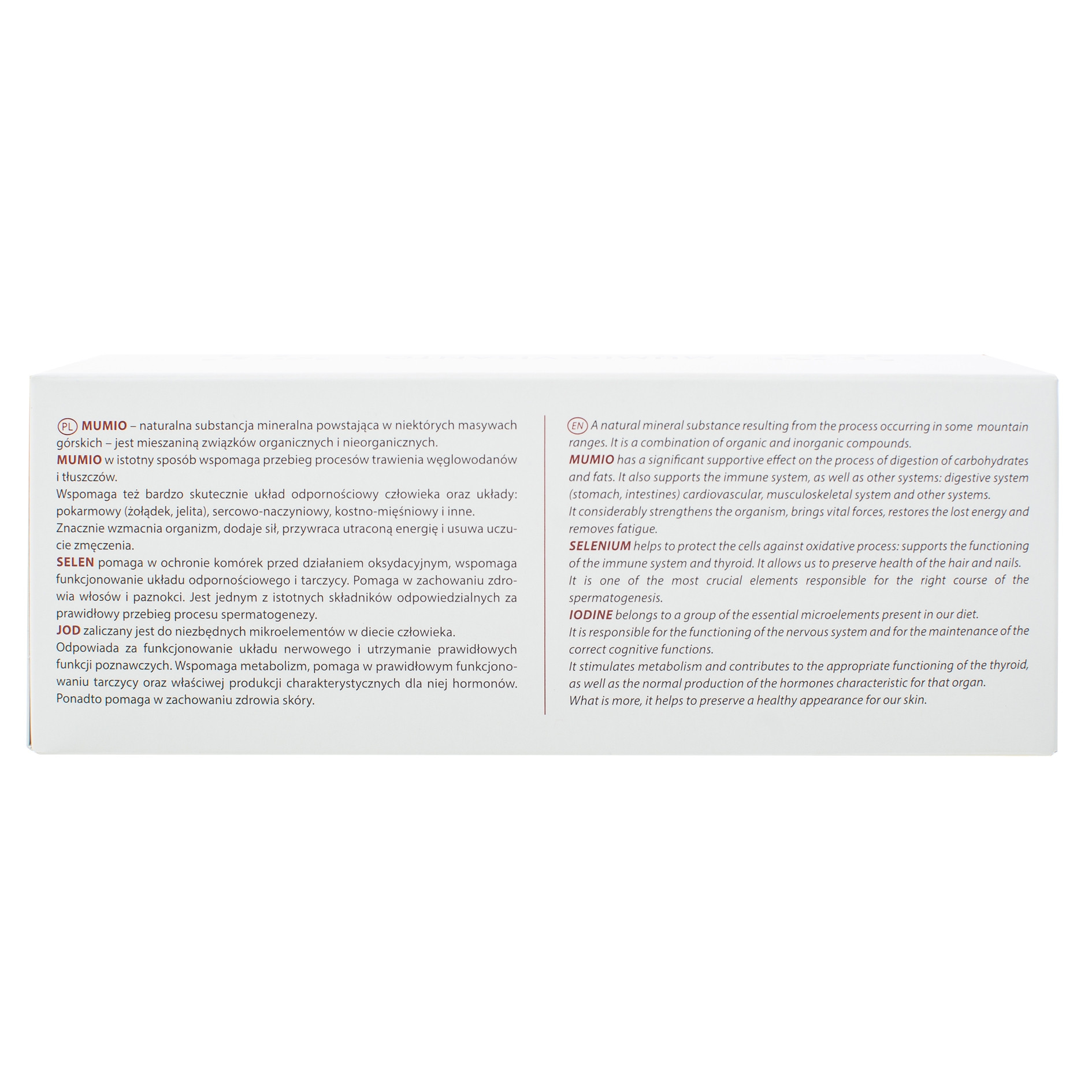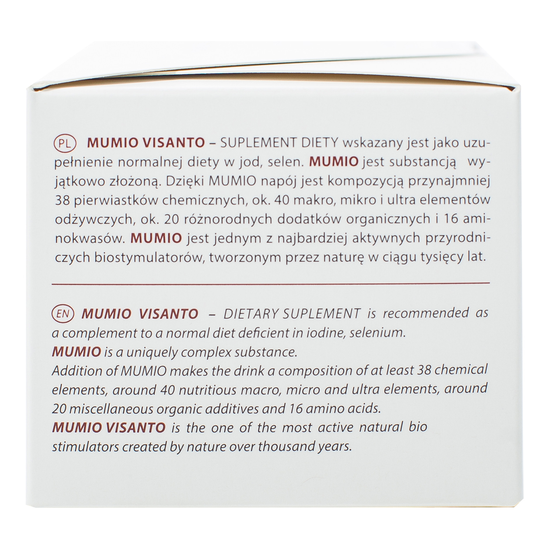 Visanto Zięba Mumio 21 buteleczek x10 mlMumio – naturalna substancja mineralna powstająca w niektórych masywach górskich – jest mieszaniną związków organicznych i nieorganicznych. Sposób użycia: