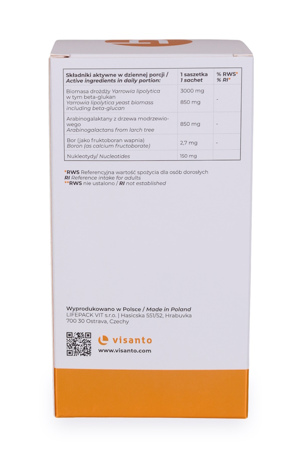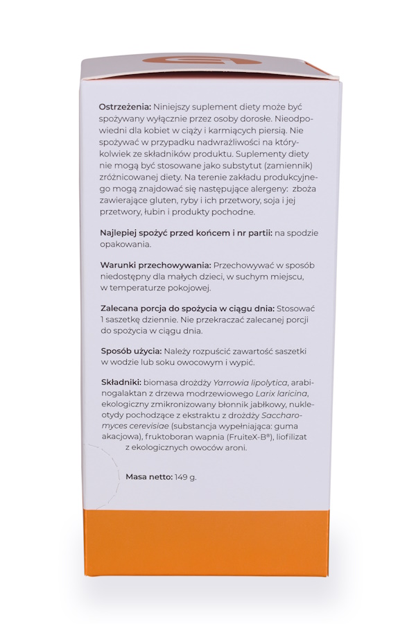 Skład:biomasa drożdży Yarrowia lipolytica, arabinogalaktan z drzewa modrzewiowego Larix laricina, ekologiczny zmikronizowany błonnik jabłkowy, nukleotydy pochodzące z ekstraktu z drożdży Saccharomyces cerevisiae (substancja wypełniająca: guma akacjowa), fruktoboran wapnia (FruiteX-B®), liofilizat z ekologicznych owoców aroni.Przechowywanie: