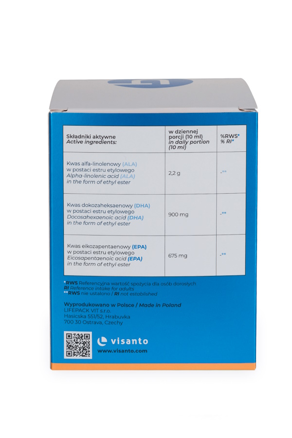 Zalecana porcja do spożycia w ciągu dnia: Skład:Estry etylowe kwasów tłuszczowych o wysokiej zawartości wielonienasyconych kwasów tłuszczowych z grupy omega pochodzenia rybiego (olej z dorsza) oraz roślinnego (olej lniany), aromat pomarańczowo-bananowy.Przechowywanie: