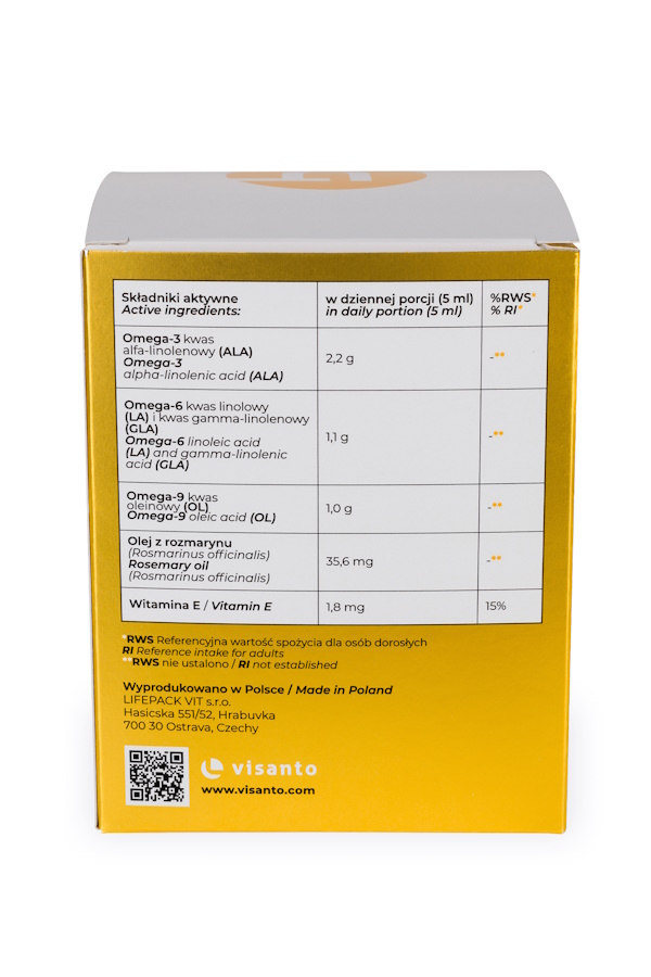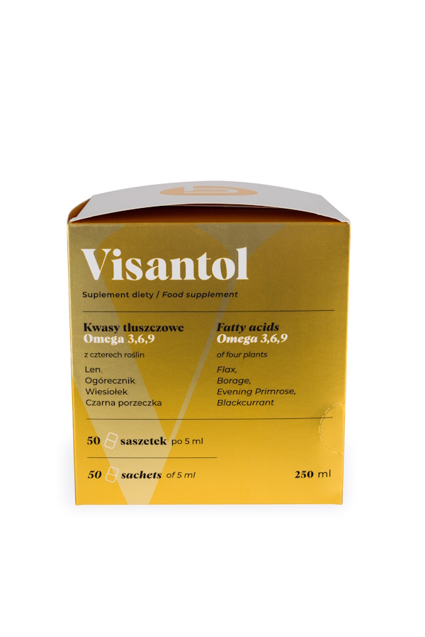 Visantol zawiera estry etylowe niezbędnych nienasyconych kwasów tłuszczowych (NNKT) Omega 3,6,9 w postaci płynnej, wyizolowane z tłoczonych na zimno olejów roślinnych (lnianego, ogórecznika, wiesiołka, czarnej porzeczki). Uzupełnia codzienną dietę w niezbędne kwasy tłuszczowe Omega 3,6,9, dostarczając je w odpowiedniej proporcji.