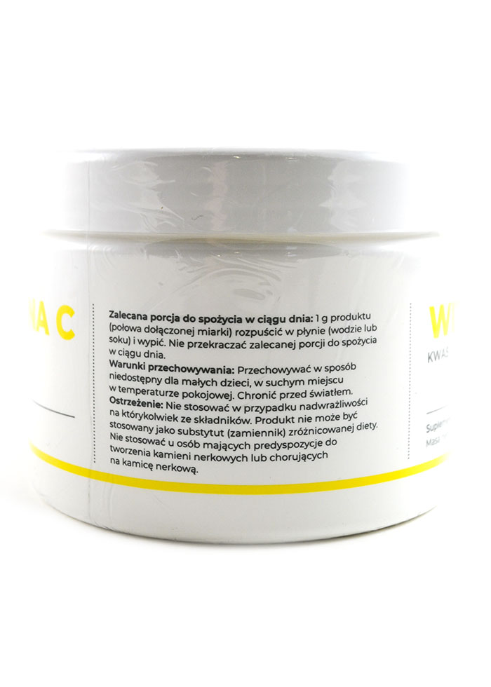 Visanto Witamina C kwas L-askorbinowy 500gSkładniki:kwas L-askorbinowy.Sposób użycia:Zalecana porcja do spożycia w ciągu dnia: 1 g produktu (połowa dołączonej miarki) rozpuścić w płynie (wodzie lub soku) i wypić. Nie przekraczać zalecanej porcji do spożycia w ciągu dnia.Ostrzeżenie: Nie stosować w przypadku nadwrażliwości na którykolwiek ze składników. Produkt nie może być stosowany jako substytut (zamiennik) zróżnicowanej diety. Nie stosować u osób mających predyspozycje do tworzenia kamieni nerkowych lub chorujących na kamicę nerkową. Przechowywanie:Przechowywać w sposób niedostępny dla małych dzieci, w suchym miejscu w temperaturze pokojowej. Chronić przed światłem.Wartości odżywcze Visanto Witamina C kwas L-askorbinowy 500gSuplement diety