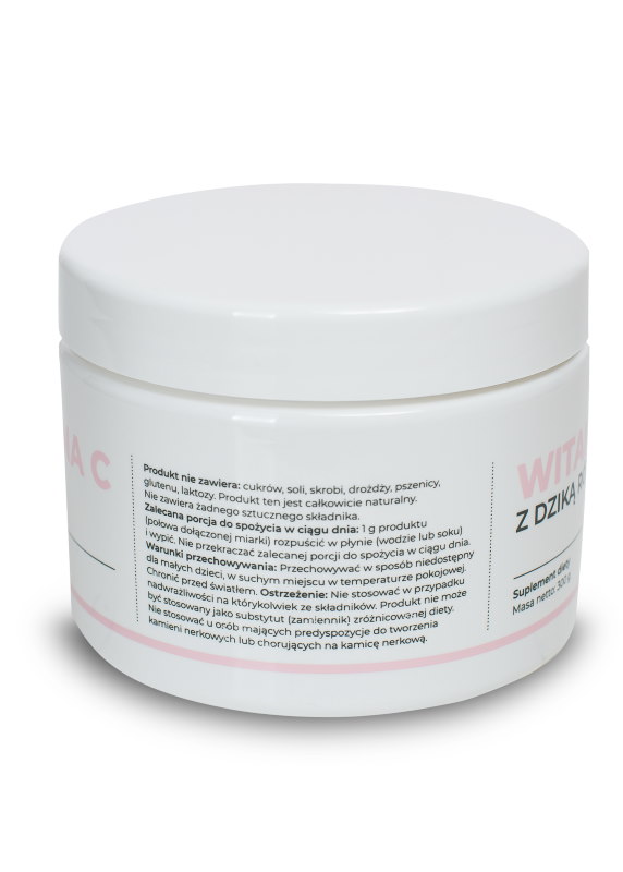 Produkt ten jest suchym, sproszkowanym EKSTRAKTEM z owoców z ekologicznych upraw dzikiej róży. Zawiera naturalne substancje, które powodują, że zawarty w tym preparacie NATURALNIE występujący kwas L-askorbinowy znacznie lepiej się wchłania. Charakterystyczną cechą tego rodzaju preparatu jest znacznie zwiększona bioaktywność, co ma kluczowe znaczenie dotyczące SKUTECZNOŚCI działania takiego kompleksu. Często spotyka się zdania, że prawdziwa witamina C, to nie tylko czysty kwas L-askorbinowy. Prawdziwa witamina C jest ZBIOREM różnych substancji, które znajdując się w obecności NATURALNEGO kwasu askorbinowego stanowią o jego pełnej, dobroczynnej biologicznej mocy.