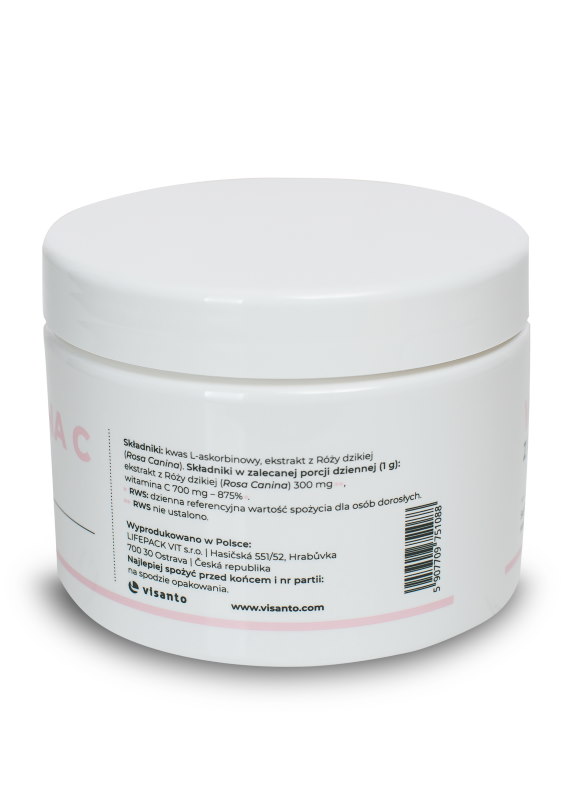 Przechowywanie:Warunki przechowywania: Przechowywać w sposób niedostępny dla małych dzieci, w suchym miejscu w temperaturze pokojowej. Chronić przed światłem.Wartości odżywcze Visanto Zięba Witamina C z dziką różą 300gSuplement diety