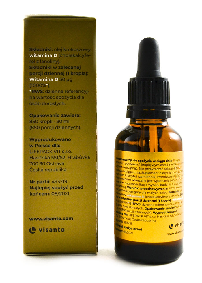olej krokoszowy Sposób użycia:1 kropla dziennie z posiłkiem. 1 kroplę wymieszać z jedzeniem.Przed użyciem wstrząsnąć. ŚRODKI OSTROŻNOŚCI: Nie przekraczać zalecanej porcji do spożycia w ciągu dnia. Suplement diety nie może być stosowany jako substytut (zamiennik) zróżnicowanej diety. Przed zastosowaniem wskazane jest wykonanie badania 25-(OH)D we krwi oraz konsultacja wyniku badania z lekarzem lub farmaceutą. Przechowywanie:Przechowywać w sposób niedostępny dla małych dzieci.Wartości odżywcze Visanto Zięba Vitamin D-3 2000IU 30 mlSuplement diety