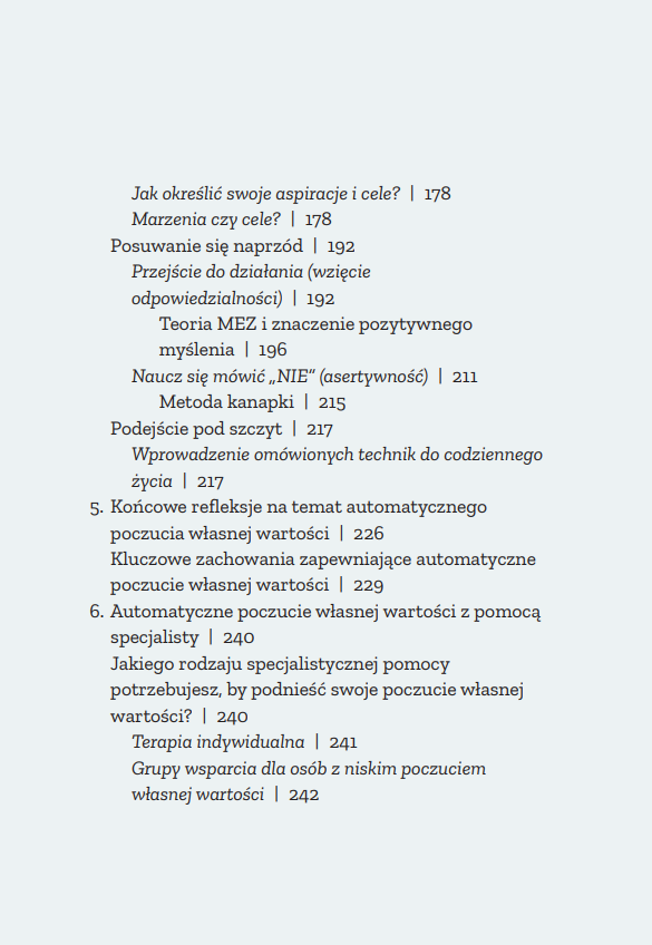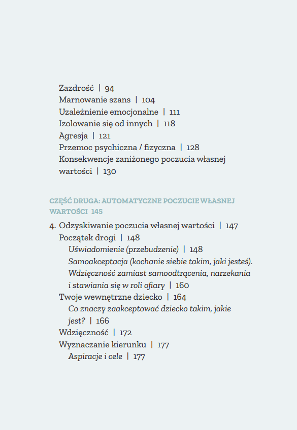 BESTSELLEROWY PORADNIK GURU ZDROWYCH RELACJI Uważasz, że nie zasługujesz na miłość i szczęście? Rezygnujesz z czegoś, na czym ci zależy, bo z góry zakładasz, że ci się nie uda? A może masz problem ze stawianiem granic? Jeśli boisz się odrzucenia, stale porównujesz się z innymi i potrzebujesz aprobaty z zewnątrz, żeby poczuć się lepiej - czas zaakceptować siebie. Odważ się wyjść ze swojej skorupy i pokazać światu, jaka naprawdę jesteś! Przed tobą pierwszy krok do trwałej zmiany i podwyższenia samooceny. Z tym poradnikiem nauczysz się, jak zadbać o swoje wewnętrzne dziecko, odrzucić błędne przekonania o sobie oraz wzmocnić poczucie własnej wartości i w pełni siebie docenić. "Zaakceptuj siebie. Jak zaprzyjaźnić się ze sobą i docenić swoją wartość"to książka kompas, która wskaże Ci kierunek w złożonym procesie budowania wysokiej samooceny, a także tworzeniu zdrowych przekonań o sobie, stawianiu granic, uciszaniu wewnętrznego krytyka i dbaniu o swoje wewnętrzne dziecko. To praktyczny poradnik o wzmacnianiu poczucia własnej wartości, dzięki któremu zostaniesz swoją najlepszą przyjaciółką i zaczniesz traktować siebie z czułością, wyrozumiałością i miłością. "Zaakceptuj siebie" to książka nie tylko dla fanów poradników Stefanie Stahl i Alexandry Reinwarth, ale również dla każdego, kto wątpi w siebie i swoje możliwości, nie docenia własnych osiągnięć i ze strachu przed porażką chowa się w swojej strefie komfortu. Zostań swoją najlepszą przyjaciółką! "Zaakceptuj siebie" rozbija poczucie własnej wartości/samo-ocenę na czynniki pierwsze i pokazuje, co możemy zrobić, aby nasze życie zyskało nową jakość. Ten poradnik wprowadzi cię w zupełnie nowy wymiar dbania o siebie. Marta Niedźwiecka AUTORKA BESTSELLERA Pokochaj siebie. Jak zbudować dobrą relację z samą sobą Silvia Congost jest ekspertką od zdrowych relacji, psycholożką specjalizującą się w obszarach samooceny, zależności emocjonalnej i konfliktów w związkach. Z uwagi na własne doświadczenia - udało jej się uwolnić z toksycznej relacji - z zaangażowaniem pomaga innym w zrywaniu więzi z destrukcyjnymi osobami oraz w budowaniu poczucia własnej wartości i uczy, jak tworzyć zdrowe związki. Jest autorką dziewięciu bestsellerowych poradników, a jej poradom zaufały już tysiące czytelniczek. Brak recenzjix