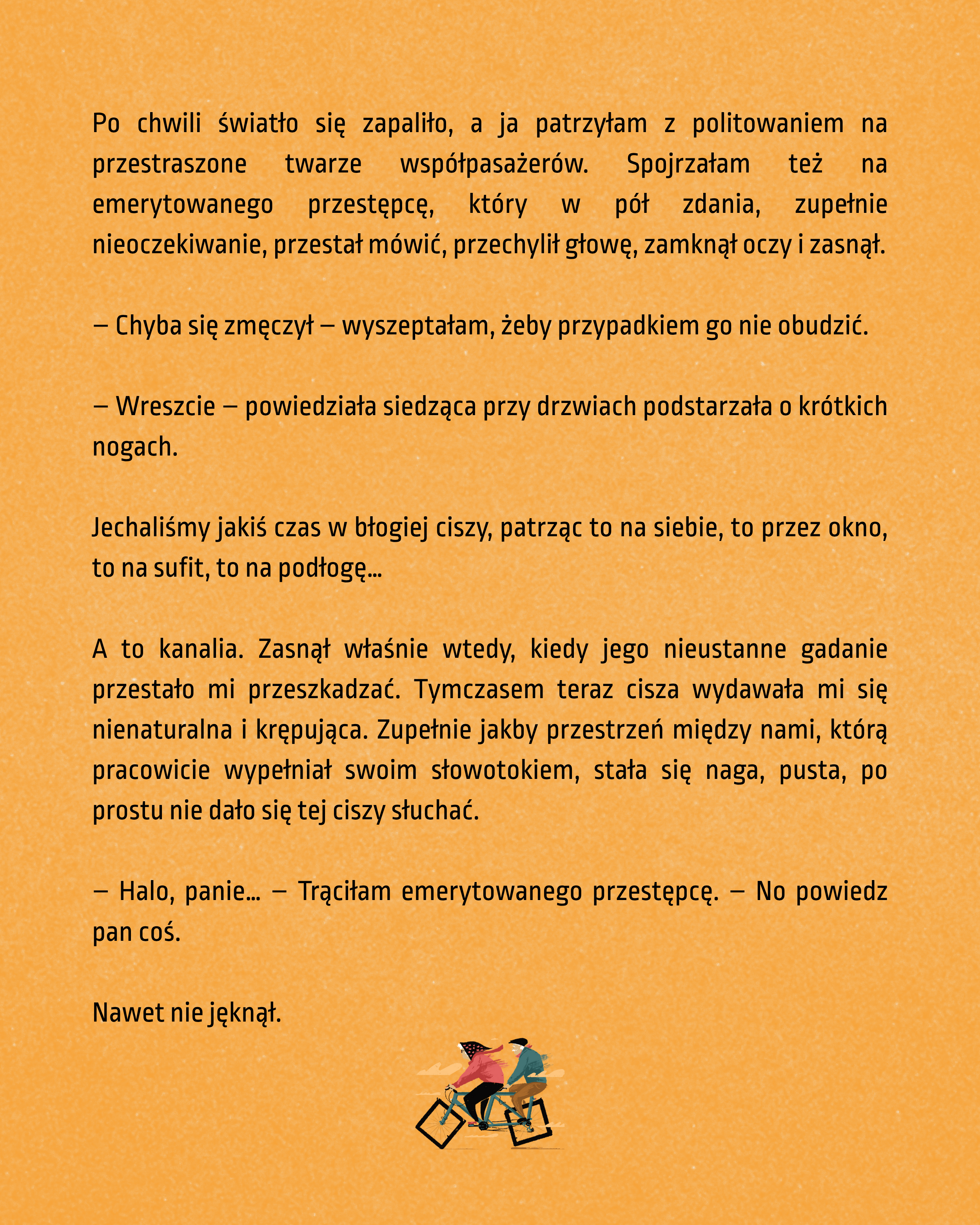 JAK WIELE NIESZCZĘŚĆ MOŻE SPAŚĆ NA GŁOWĘ JEDNEJ STARUSZKI? Pociąg dopiero rusza ze stacji w Legionowie, a Sabina już czuje, że zaczynają się kłopoty. W jej przedziale siedzi najbardziej gadatliwy eksprzestępca świata. I ma ochotę opowiedzieć wszystkim historię swojego życia. Idzie mu całkiem nieźle, dopóki nagle nie milknie i tak po prostu pada trupem. Zostaje po nim tylko pusty kubek po herbacie. Tej, którą miała wypić Sabina Istnieją jednak większe problemy od opóźnionego pociągu! Zręczny unik przed morderczym napojem i szybka ewakuacja z wagonu to dopiero początek przygód staruszki. Do odysei Sabinki dołącza szarmancki, ale nieco flegmatyczny Antoni, co niczego nie ułatwia. Na dodatek po piętach depczą im prawdziwe typy spod ciemnej gwiazdy Ale czemu uwzięły się akurat na dwójkę emerytów? I dlaczego sądzą, że czymś ich jeszcze w życiu zaskoczą? Brak recenzjix