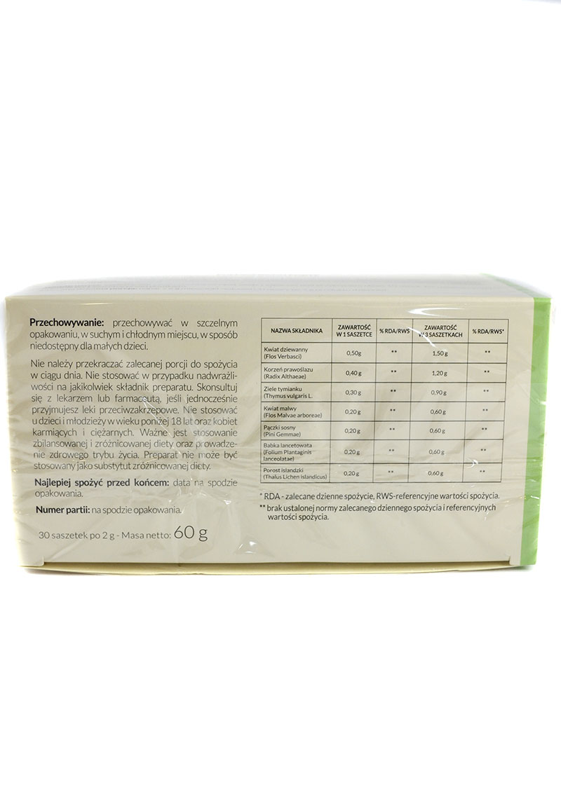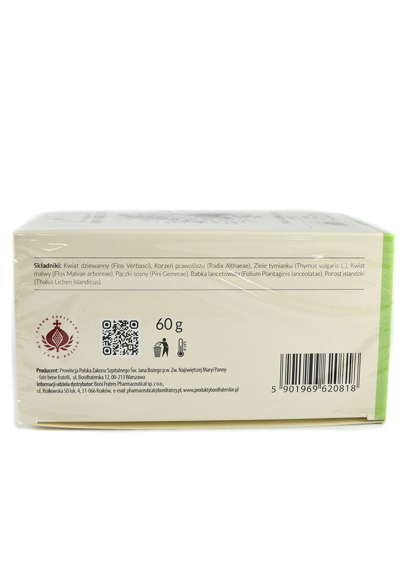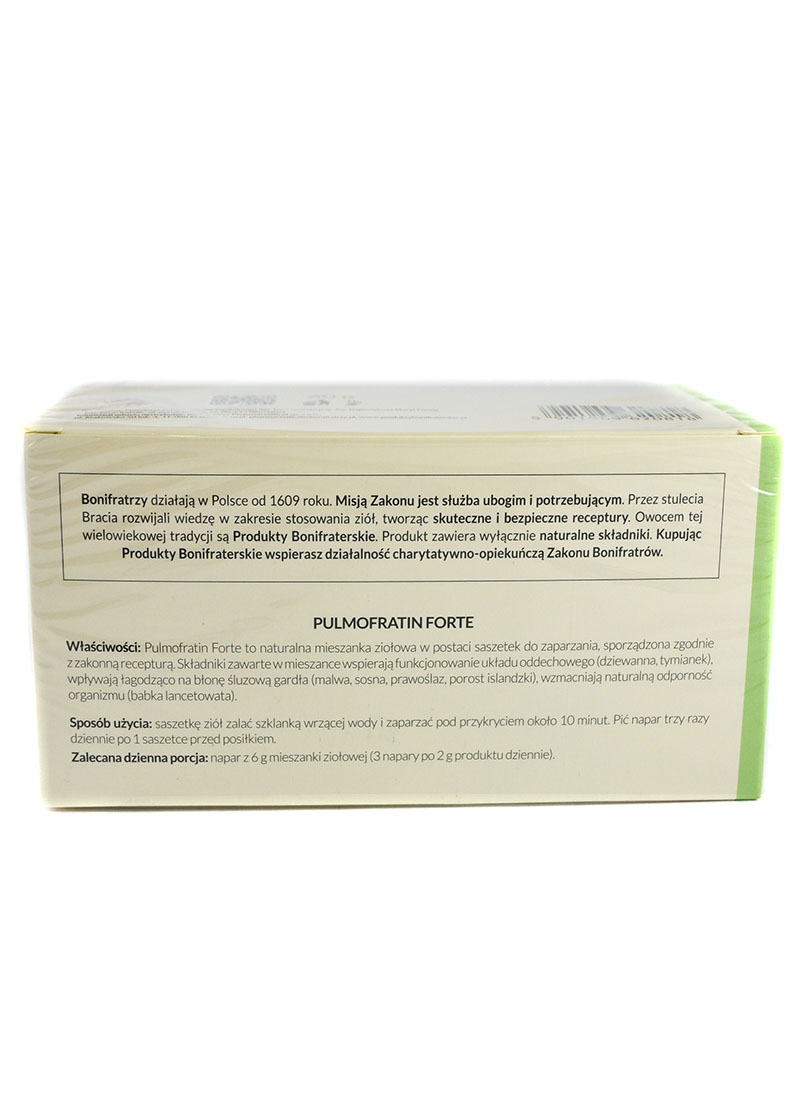 Składniki:Kwiat dziewanny (Flos Verbasci), Korzeń prawoślazu (Radix Althaeae), Ziele tymianku (Thymus vulgaris L.), Kwiat malwy (Flos Malvae arboreae), Pączki sosny (Pini Gemmae), Babka lancetowata (Folium Plantaginis lanceolatae), Porost islandzki (Thalus Lichen islandicus). Zakon Bonifratrów:Bonifraterskie produkty są produkowane w Klasztorze, tworzone są z należytą starannością według zakonnej receptury, aby sprostać potrzebom najbardziej wymagających Pacjentów. Specjalnie dobrane składniki w naturalny sposób pielęgnują i chronią skórę oraz wykazują pozytywny efekt wspomagania organizmu w poszczególnych dolegliwościach.Bonifratrzy działają w Polsce od 1609 roku. Misją Zakonu jest służba ubogim i potrzebującym. Przez stulecia bracia rozwijali wiedzę w zakresie stosowania ziół, tworząc skuteczne i bezpieczne receptury. Owocem tej wielowiekowej tradycji są Produkty Bonifraterskie. Wartości odżywcze Zioła Bonifratrów Pulmofratin Forte herbatka na układ oddechowy 60g 30x2g