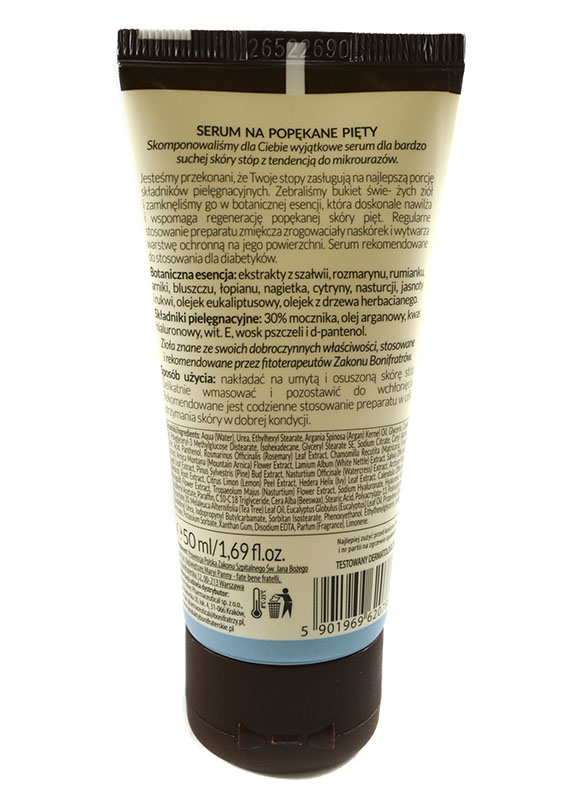 Stosowanie:nakładać na umytą i osuszoną skórę stóp. Delikatnie wmasować i pozostawić do wchłonięcia. Rekomendowane jest codzienne stosowanie preparatu w celu utrzymania skóry w dobrej kondycji. Składniki INCI:Aqua (Water), Urea, Ethylhexyl Stearate, Argania Spinosa (Argan) Kernel Oil, Glycerin, Canola Oil, Polyglyceryl-3 Methylglucose Distearate, Isohexadecane, Glyceryl Stearate SE, Sodium Citrate, Cetyl Alcohol, Citric Acid, Panthenol, Rosmarinus Officinalis (Rosemary) Leaf Extract, Chamomilla Recutita (Matricaria) Flower Extract, Arnica Montana (Mountain Arnica) Flower Extract, Lamium Album (White Nettle) Extract, Salvia Officinalis (Sage) Leaf Extract, Pinus Sylvestris (Pine) Bud Extract, Nasturtium Officinale (Watercress) Extract, Arctium Majus (Burdock) Root Extract, Citrus Limon (Lemon) Peel Extract, Hedera Helix (Ivy) Leaf Extract, Calendula Officinalis (Marigold) Flower Extract, Tropaeolum Majus (Nasturtium) Flower Extract, Sodium Hyaluronate, Hyaluronic Acid, Tocopheryl Acetate, Paraffin, C10-C18 Triglyceride, Cera Alba (Beeswax), Stearic Acid, Polyacrylate-13, Polyisobutene, Polysorbate 20, Melaleuca Alternifolia (Tea Tree) Leaf Oil, Eucalyptus Globulus (Eucalyptus) Leaf Oil, Propylene Glycol, Diazolidinyl Urea, Iodopropynyl Butylcarbamate, Sorbitan Isostearate, Phenoxyethanol, Ethylhexylglycerin, Sodium Benzoate, Potassium Sorbate, Xanthan Gum, Disodium EDTA, Parfum (Fragrance), Limonene. Zakon Bonifratrów:Bonifraterskie maści produkowane w Klasztorze, tworzone są z należytą starannością według zakonnej receptury, aby sprostać potrzebom najbardziej wymagających Pacjentów. Specjalnie dobrane składniki w naturalny sposób pielęgnują i chronią skórę oraz wykazują pozytywny efekt wspomagania organizmu w poszczególnych dolegliwościach.Bonifratrzy działają w Polsce od 1609 roku. Misją Zakonu jest służba ubogim i potrzebującym. Przez stulecia bracia rozwijali wiedzę w zakresie stosowania ziół, tworząc skuteczne i bezpieczne receptury. Owocem tej wielowiekowej tradycji są Produkty Bonifraterskie.