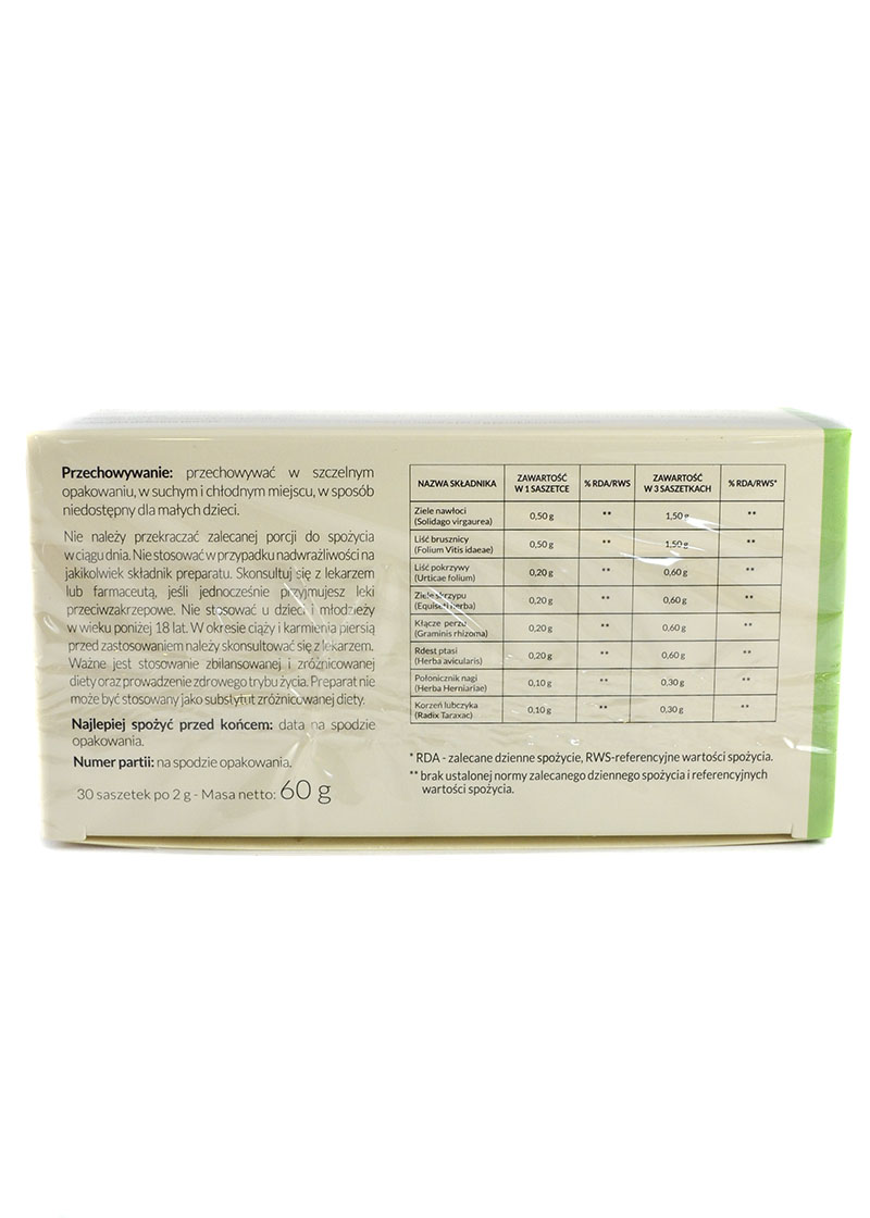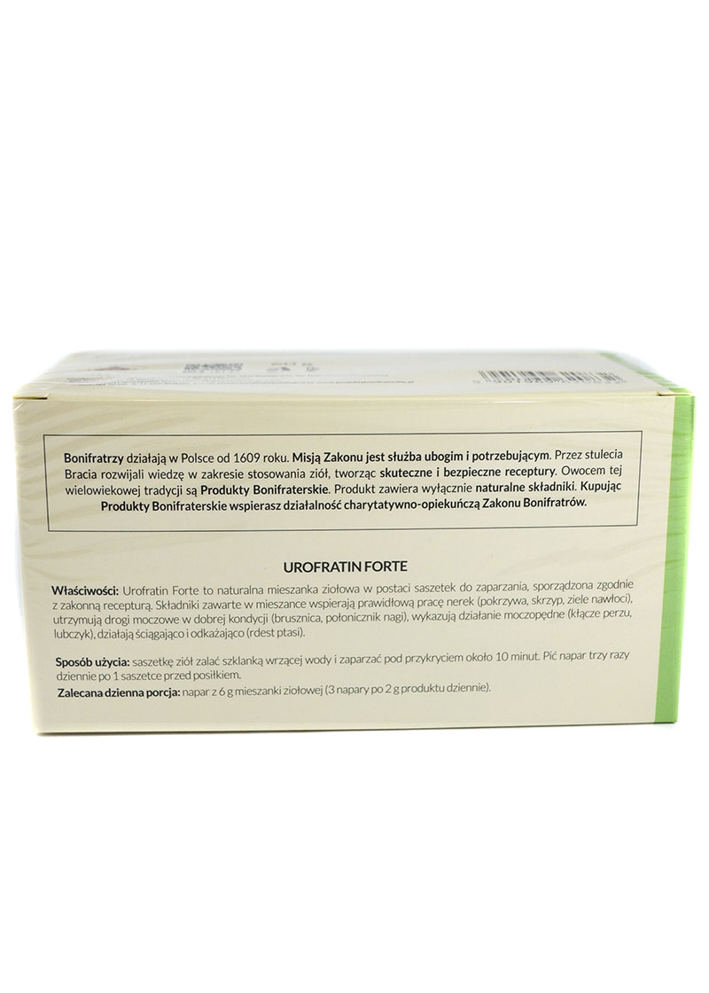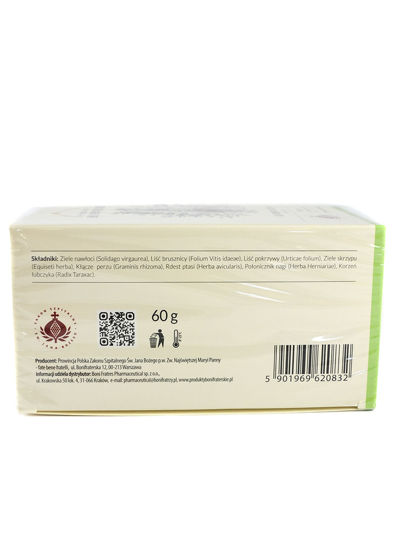 Ziele nawłoci (Solidago virgaurea), Liść brusznicy (Folium Vitis idaeae), Liść pokrzywy (Urticae folium), Ziele skrzypu (Equiseti herba), Kłącze perzu (Graminis rhizoma), Rdest ptasi (Herba avicularis), Połonicznik nagi (Herba Herniariae), Korzeń lubczyka (Radix Taraxac) Zakon Bonifratrów:Bonifraterskie maści produkowane w Klasztorze, tworzone są z należytą starannością według zakonnej receptury, aby sprostać potrzebom najbardziej wymagających Pacjentów. Specjalnie dobrane składniki w naturalny sposób pielęgnują i chronią skórę oraz wykazują pozytywny efekt wspomagania organizmu w poszczególnych dolegliwościach.Bonifratrzy działają w Polsce od 1609 roku. Misją Zakonu jest służba ubogim i potrzebującym. Przez stulecia bracia rozwijali wiedzę w zakresie stosowania ziół, tworząc skuteczne i bezpieczne receptury. Owocem tej wielowiekowej tradycji są Produkty Bonifraterskie. Wartości odżywcze Zioła Bonifratrów Urofratin Forte herbatka na nerki 60g 30x2g