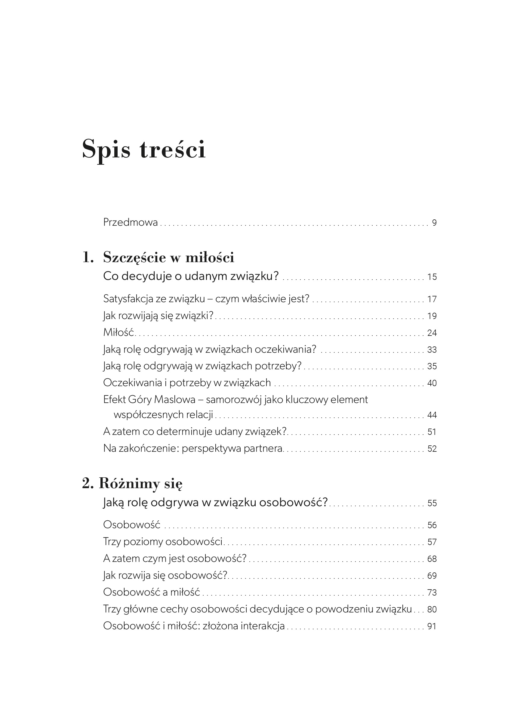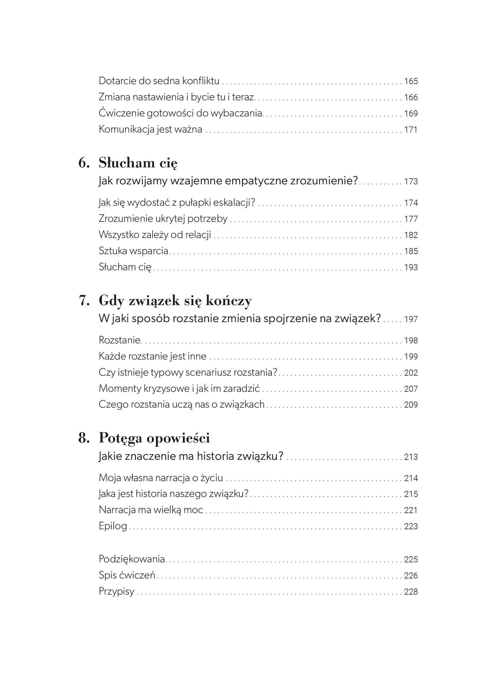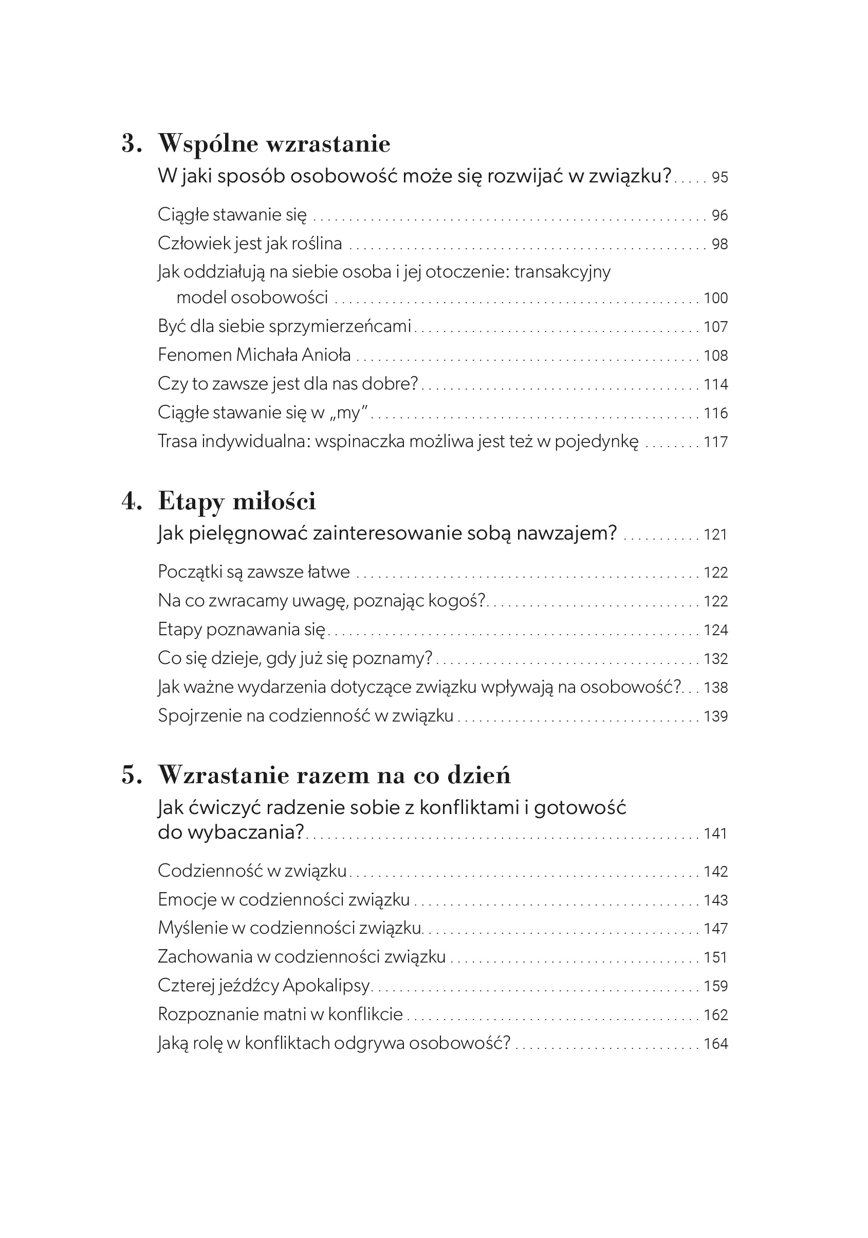 Co sprawia, że związek jest satysfakcjonujący dla obu stron? Co zrobić, aby nasza relacja kwitła, a przy tym pomagała nam się rozwijać, zamiast nas ograniczać? Jak osiągnąć równowagę między „ja”, „ty” i „my”? Psycholożka i naukowczyni Janina Larissa Bühler odkrywa przed czytelnikami tajemnice kształtowania się ludzkiej osobowości i jej wpływu na relacje, a także udowadnia, że zarówno podobieństwa, jak i różnice między partnerami są fundamentami trwałych i szczęśliwych związków. Z książki dowiesz się, jak: • lepiej poznać samego siebie poprzez związek, • traktować zmiany jako okazje, a nie zagrożenie dla relacji, • stale się rozwijać, razem i osobno, • osiągnąć głębokie wzajemne zrozumienie, • unikać eskalacji konfliktów i wyciągać z nich konstruktywne wnioski, • przeciwdziałać nudzie i monotonii, • wspólnie pogłębiać empatię i zdolność do wybaczania, • wiedzieć, jak i kiedy się rozstać. Opierając się na wynikach najnowszych badań, autorka oferuje mnóstwo przystępnie podanej wiedzy, praktyczne ćwiczenia do wykonania samemu lub z partnerem i pytania skłaniające do refleksji, które pomogą ci rozbudzić radość z poznawania najbliższej osoby i zadbać o waszą relację jak nigdy wcześniej. „Ludzie chcą się rozwijać w każdym wieku. Bez względu na to, od jak dawna są parą, zawsze mogą się wspierać w stawaniu się takimi, jakimi chcą być. To wzajemne wsparcie sprawia, że gdy się rozwijamy, możemy kochać intensywniej. Kiedy bowiem wzrastamy, jesteśmy szczęśliwsi. A kiedy jesteśmy szczęśliwsi, kochamy piękniej, swobodniej i radośniej”. „Związki partnerskie stwarzają idealne warunki do rozwoju osobistego. Dzieje się tak dlatego, że w bodaj żadnym innym kontekście nie poznajemy drugiej osoby tak bezpośrednio i osobiście, jak w intymnej relacji. Możemy dostrzec w partnerze odbicie wzorców zachowań, których nie lubimy w nas samych, lub odkryć nieznane nam dotychczas strony własnej osobowości. Konfrontujemy się z kimś, kto ma własne preferencje i system wartości, dzięki czemu otwierają się przed nami nowe światy”.